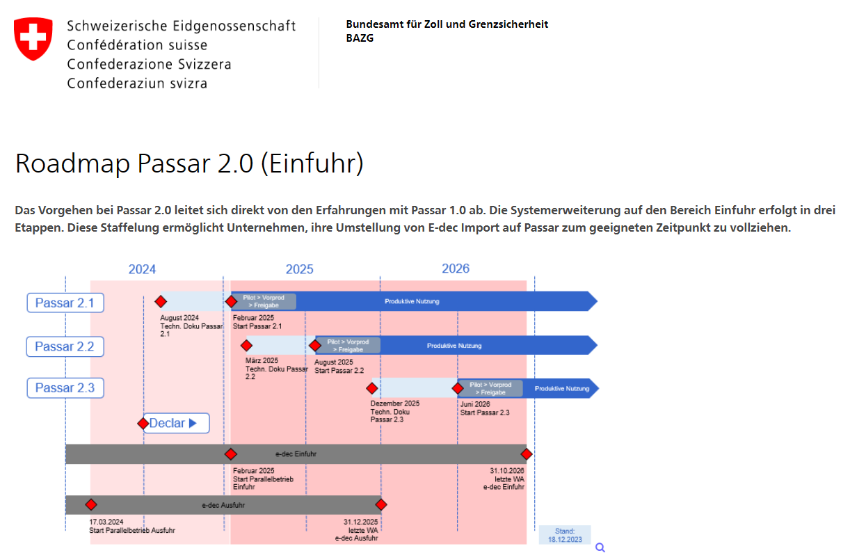 Das Vorgehen bei Passar 2.0 leitet sich direkt von den Erfahrungen mit Passar 1.0 ab. Die Systemerweiterung auf den Bereich Einfuhr erfolgt in drei Etappen. Diese Staffelung ermöglicht Unternehmen, ihre Umstellung von E-dec Import auf Passar zum geeigneten Zeitpunkt zu vollziehen.
