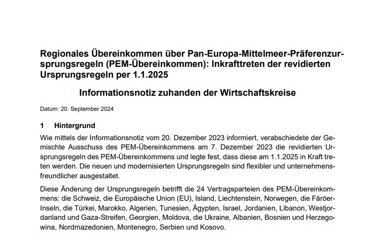 a. Vom 01.01.2025 bis zum 31.12.2025: Wie heute werden innerhalb der PEM-Zone zwei Sets an Regeln (d.h. das alte PEM-Übereinkommen sowie die revidierten Regeln (heutige Übergangsregeln)) gelten. Im Handel wird die Situation je nach Partner bzw. Freihandelsabkommen (FHA) zu berücksichtigen sein: