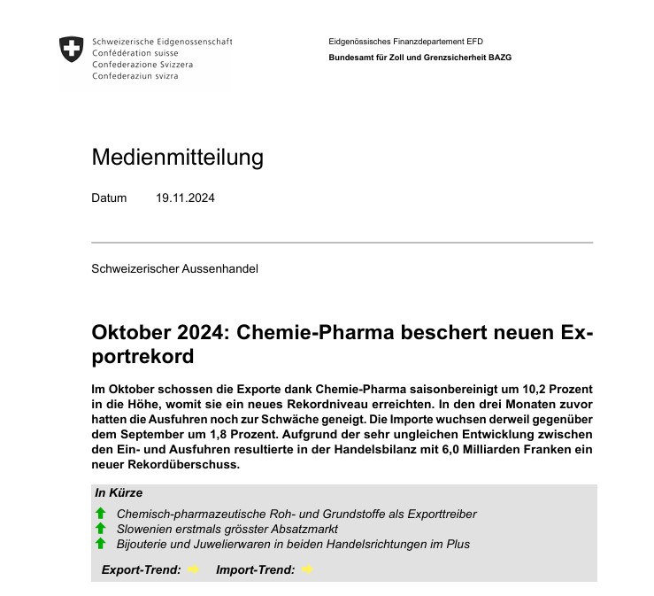 In den drei Monaten zuvor hatten die Ausfuhren noch zur Schwäche geneigt. Die Importe wuchsen derweil gegenüber dem September um 1,8 Prozent. Aufgrund der sehr ungleichen Entwicklung zwischen den Ein- und Ausfuhren resultierte in der Handelsbilanz mit 6,0 Milliarden Franken ein neuer Rekordüberschuss.