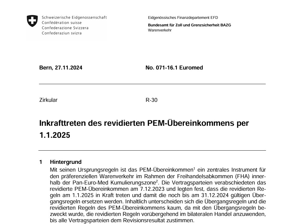 Im Zirkular des BAZG vom 27.11.2024 informiert dies im Detaile über die anstehenden Umstellungen, Übergangsfristen und die Anwendung der neuen PEM Regeln! Dies hat auch Auswerkungen auf die Ausstellung von Lieferantenerklärungen im Inland.