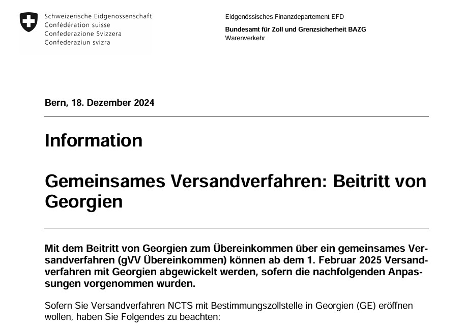 Mit dem Beitritt von Georgien zum Übereinkommen über ein gemeinsames Ver sandverfahren (gVV Übereinkommen) können ab dem 1. Februar 2025 Versand verfahren mit Georgien abgewickelt werden.