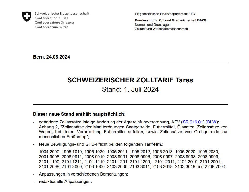 ...von der Anpassung im Tares betroffen sind Zollansätze der Agrareinfuhrverordnung und neuen Bewilligungs- und GTU-Pflicht bei diversen Zolltarifnummer der Kapitel 19 - 22, sowie Anpassungen in verschiedenen Bemerkungen.