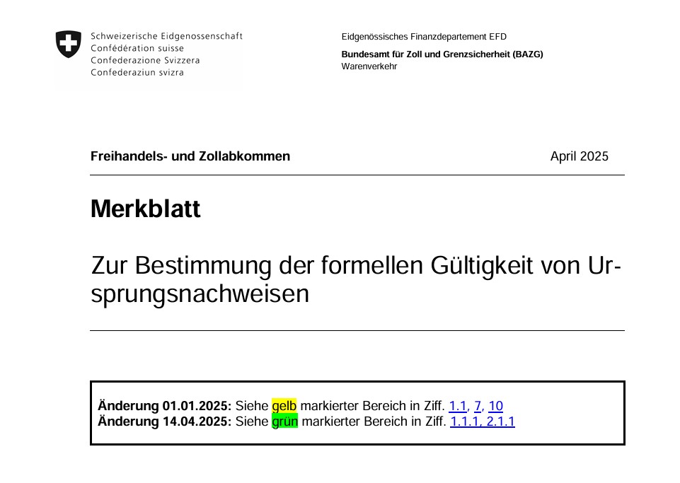 Per 14.04.2025 sind Änderungen bei den Präferenznachweisen zu berücksichtigen. Sie Finden diese, wie immer farblich markiert, im Merkblatt des BAZG.