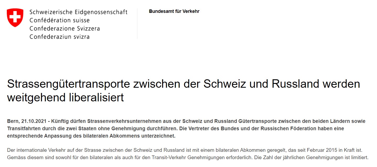 Wie das Bundesamt für Verkehr heute mitteilt, dürfen künftig Strassenverkehrsunternehmen aus der Schweiz und Russland Gütertransporte zwischen den beiden Ländern sowie Transitfahrten durch die zwei Staaten ohne Genehmigung durchführen.